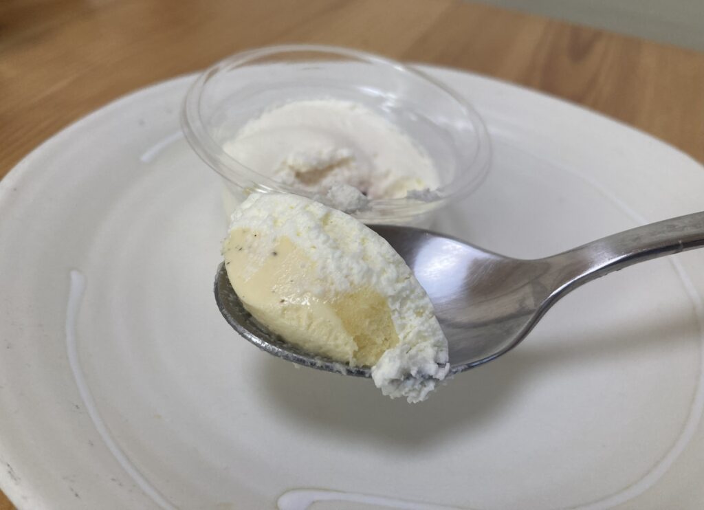 実食!口に運ぶと、ホイップクリームのコクはありますが、しつこくない優しい甘さが広がります。ババロアは、とろんとした食感で後ろに卵を感じるほど濃厚。後味スッキリのホイップクリームと絶妙なバランスでした。